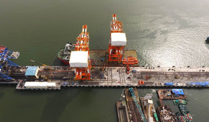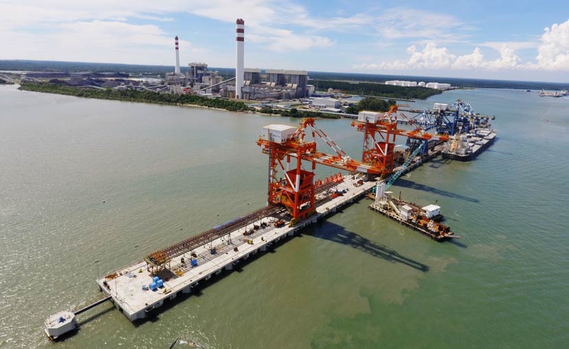 Tanjung Bin電廠在碼頭一期工程建設時,配置了2臺德國鏈斗卸船機。2012年,電廠考慮將鏈斗卸船機更換為抓斗卸船機。當年,華新機電與Tanjung Bin電廠進行了第一次合作,并于2013年提供了1臺2000tph抓斗卸船機,在電廠碼頭采用大件吊裝的方式吊裝上岸并順暢使用。2017年,Tanjung Bin電廠進行碼頭二期的工程建設。電廠向華新機電再次采購了2臺2400tph抓斗卸船機,要求采用滾裝上岸方式交貨。2018年10月,兩臺2400tph抓斗卸船機在Tanjung Bin電廠碼頭順利滾裝上岸。