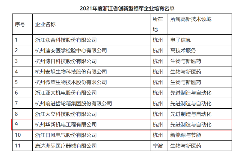 近日,浙江省科(ke)學技(ji)術廳發布了(le)《關于公(gong)布2021年浙江省創(chuang)(chuang)(chuang)新型(xing)領軍企業(ye)(ye)名單(dan)的通知》,華新機電(dian)憑(ping)借持續提升的自主研(yan)發與科(ke)技(ji)創(chuang)(chuang)(chuang)新實力(li),成功(gong)入選“2021年度浙江省創(chuang)(chuang)(chuang)新型(xing)領軍企業(ye)(ye)”培育名單(dan)。